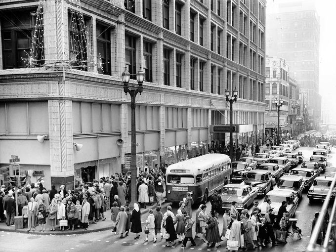 A Public Service bus is seen amid downtown streets that are filled with Christmas shoppers at the intersection of Seventh and Locust Streets outside the Downtown Famous-Barr in 1960.